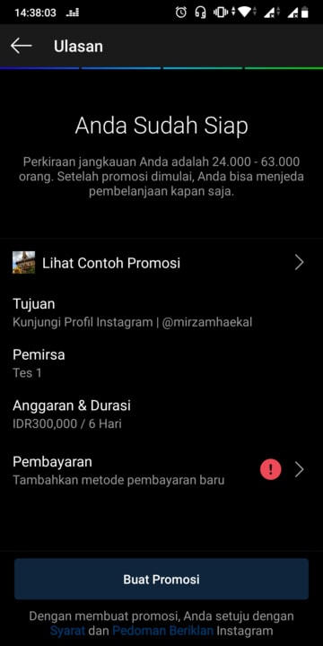 - Terakhir, cek apakah semua sudah Anda isi dengan sesuai dan lakukan pembayaran. Anda bisa membayar menggunakan kartu kredit/debit dan transfer bank. Setelah pembayaran dikonfirmasi, Anda bisa mulai menerbitkan Instagram Ads dengan klik Buat Promosi.