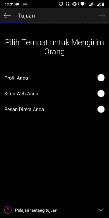 - Langkah kedua adalah menentukan tujuan Anda membuat Instagram Ads ini. Ada tiga pilihan: mengarahkan orang-orang ke akun bisnis Anda, mengarahkan ke website, atau mengarahkan orang untuk mengirimkan DM kepada Anda.