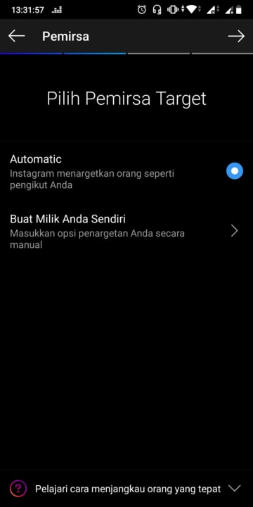 - Langkah keempat mengharuskan Anda untuk memilih target audiens. Anda bisa memilih opsi Automatic untuk membuat target Instagram Ads mirip dengan demografi follower Anda sekarang. Atau pilih Buat Milik Sendiri untuk menentukan secara manual target audiens Anda.
