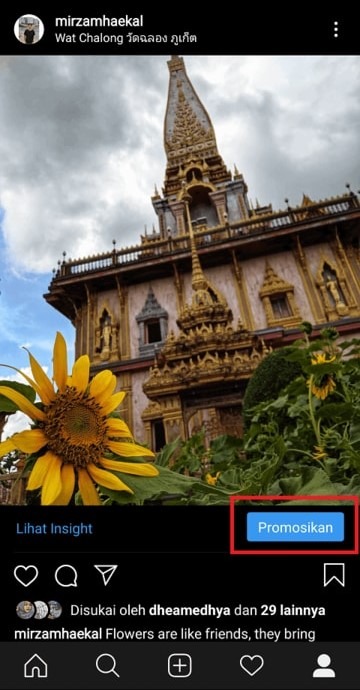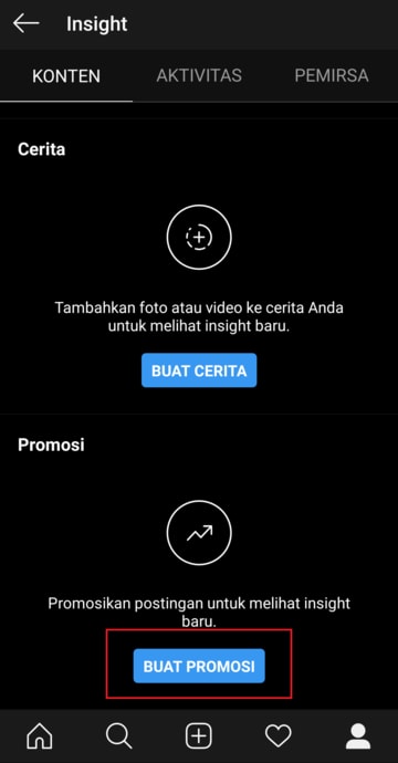 Atau Anda juga bisa melakukannya melalui Insight. Tinggal masuk saja ke menu Insight dan scroll ke paling bawah, lalu klik tombol Buat Promosi.